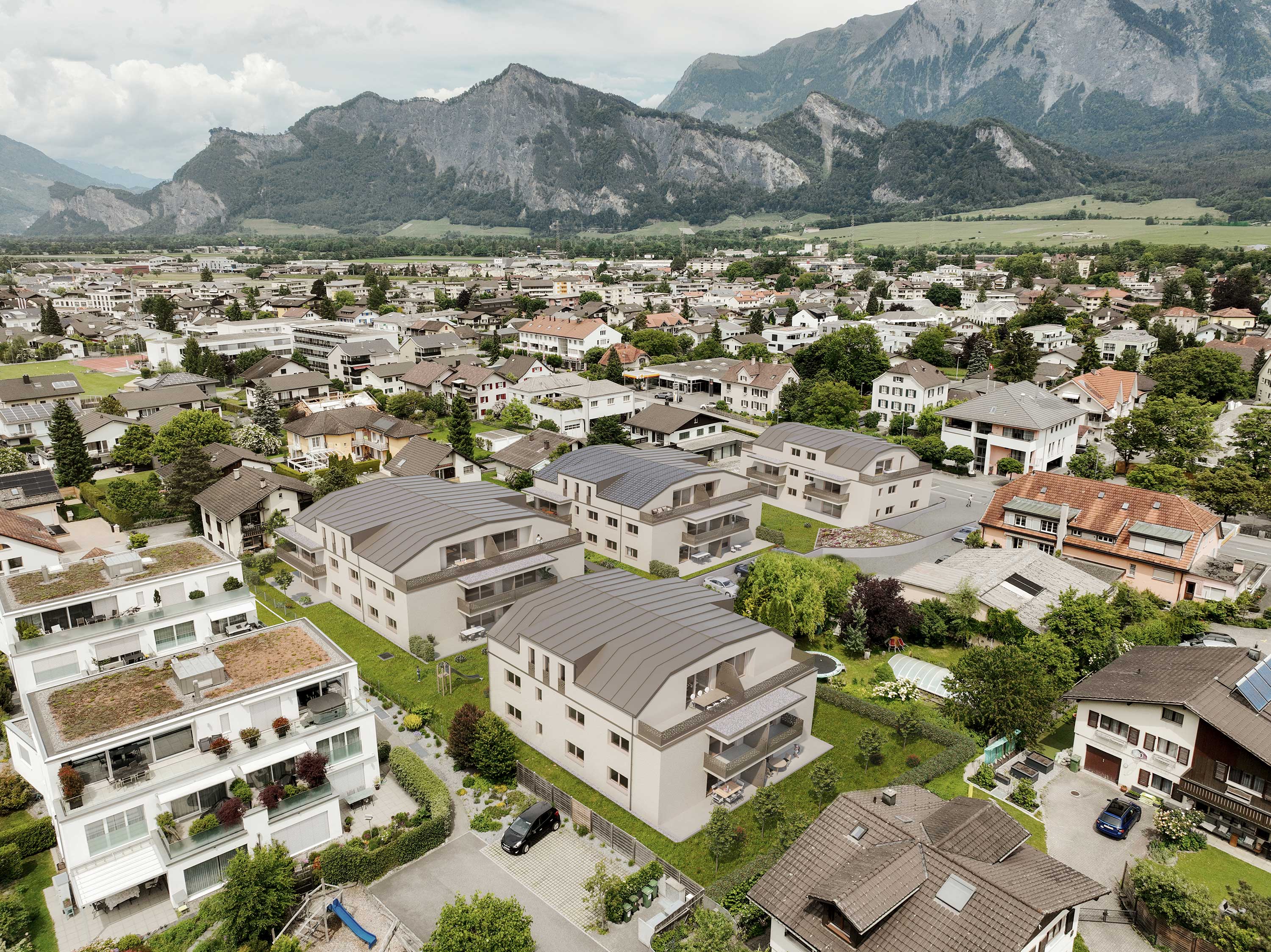 Lebensqualität pur: Die Wohnüberbauung Ragaces liegt mitten im Zentrum und Schulen, Einkaufsläden, Restaurants sowie Freizeitaktivitäten können einfach und in kurzen Distanzen zu Fuss erreicht werden.